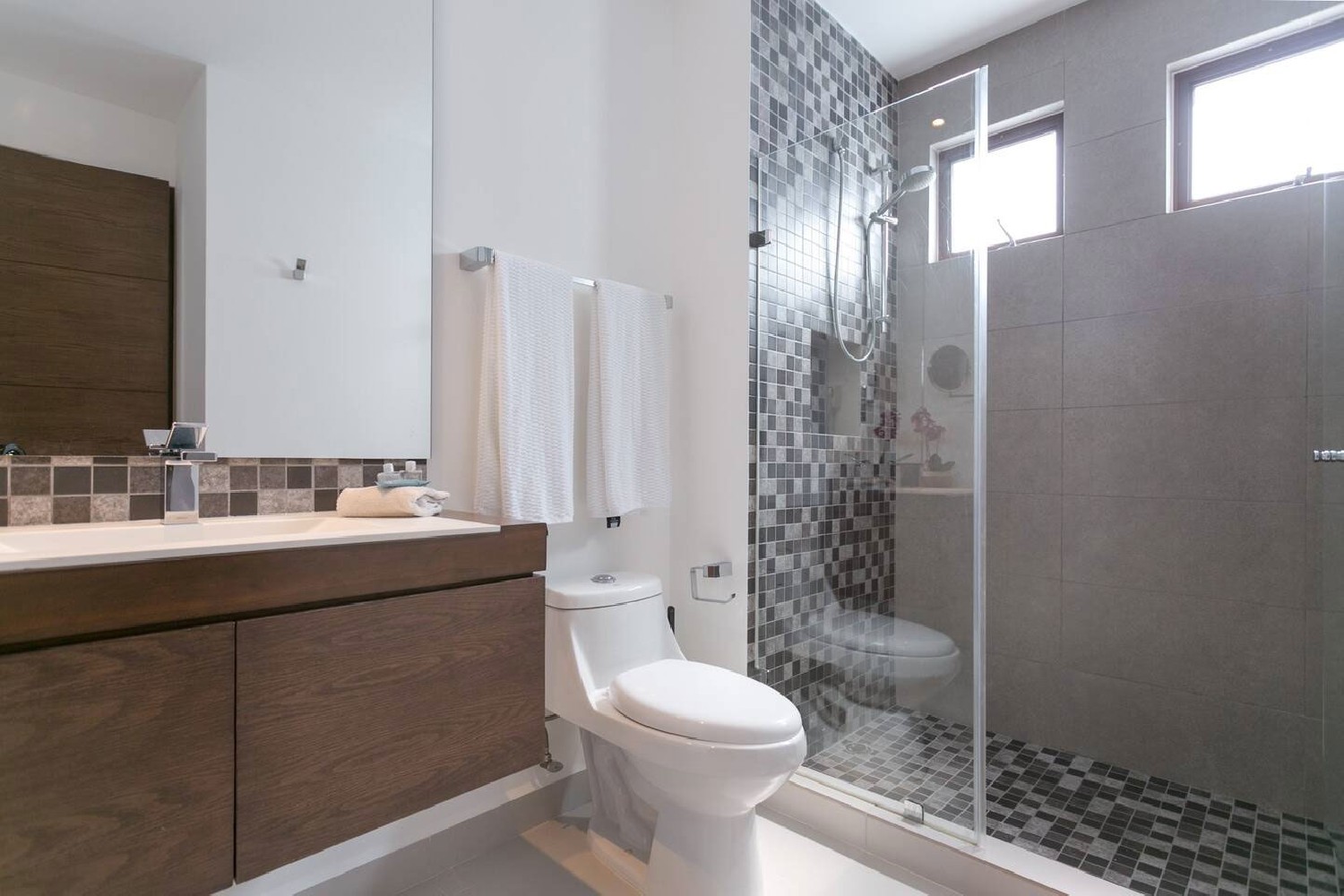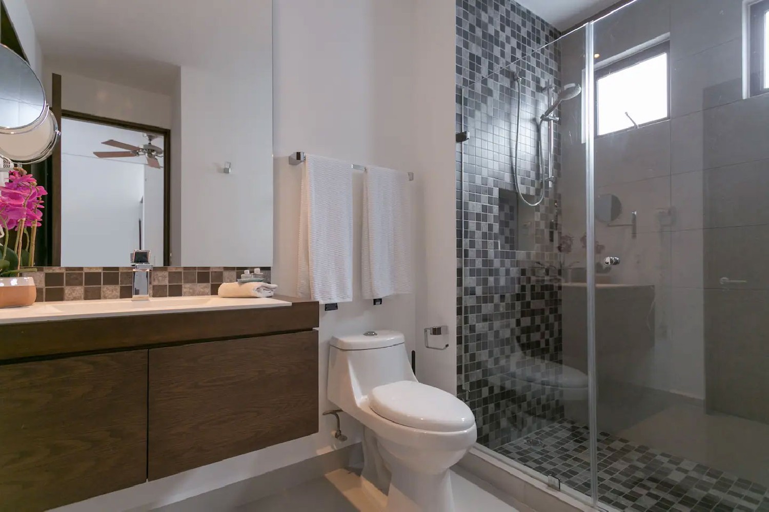 • En-suite bathroom with glass shower stall